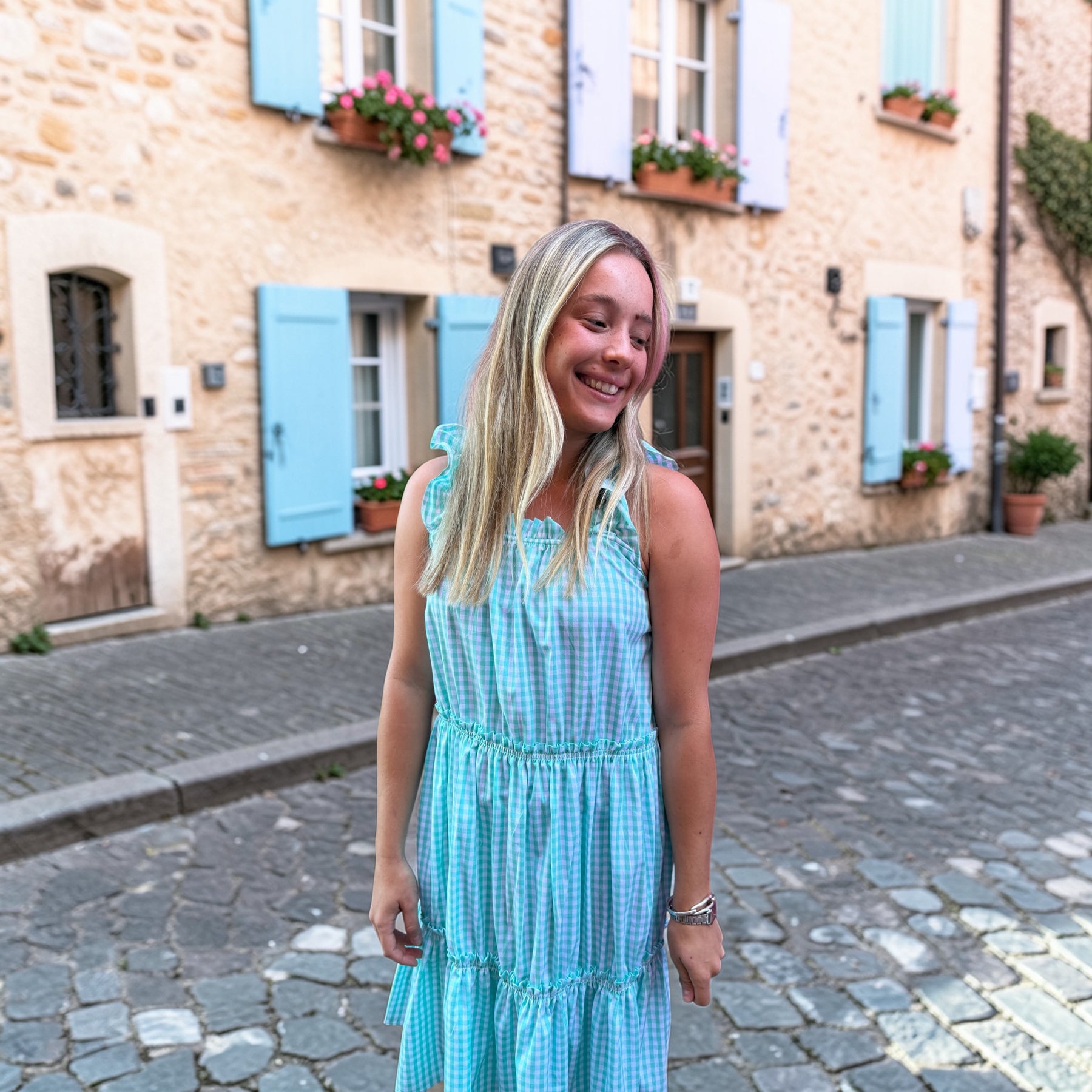 The prettiest pure cotton gingham dress – perfect as a nightie, a nap dress or a summer dress for the beach. The Gingham collection is made from luxurious organic cotton poplin and features the most beautiful ruffles on the shoulders and neckline with elastic under to allow for the most comfortable fit imaginable. The dress also comes with two additional elastic-bound mini frills around the body for extra stretch and comfort. This is a generous fit.
