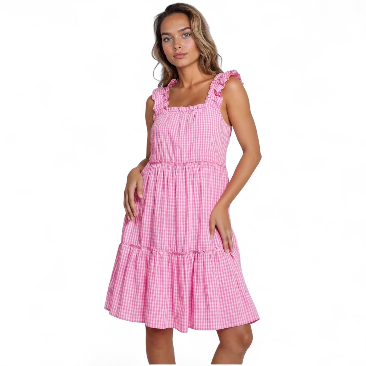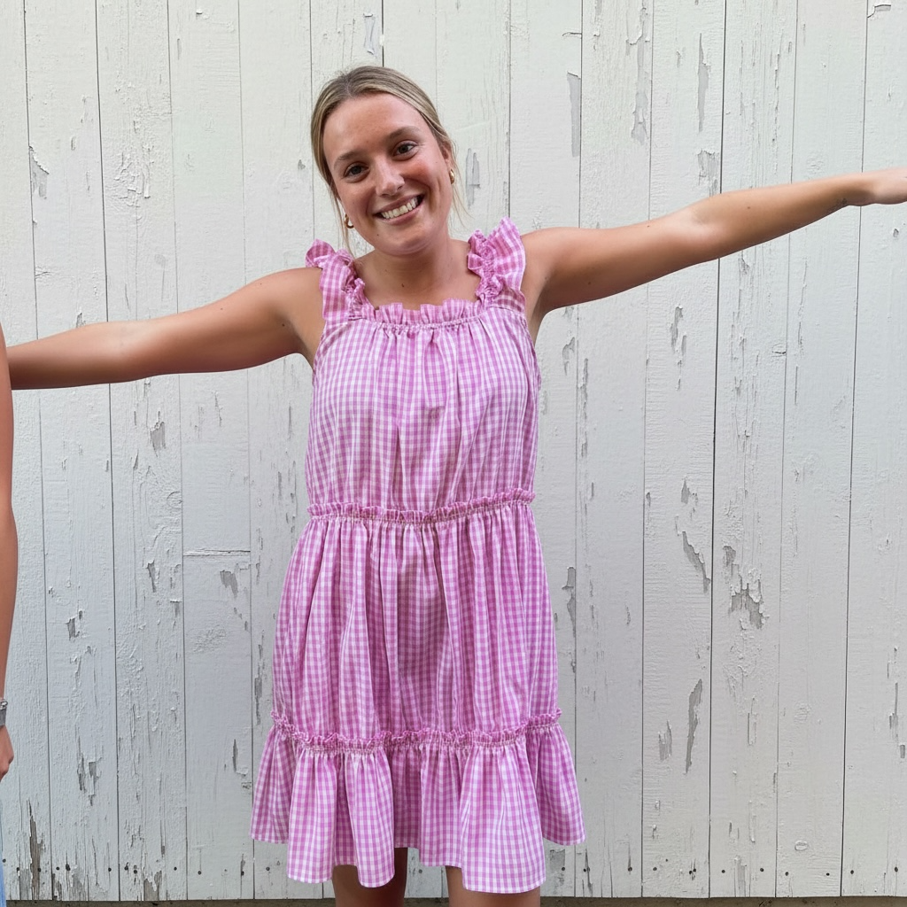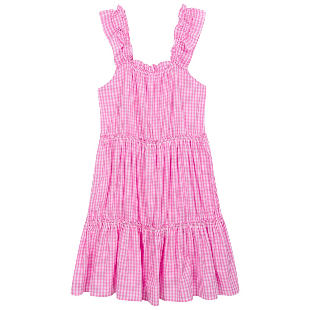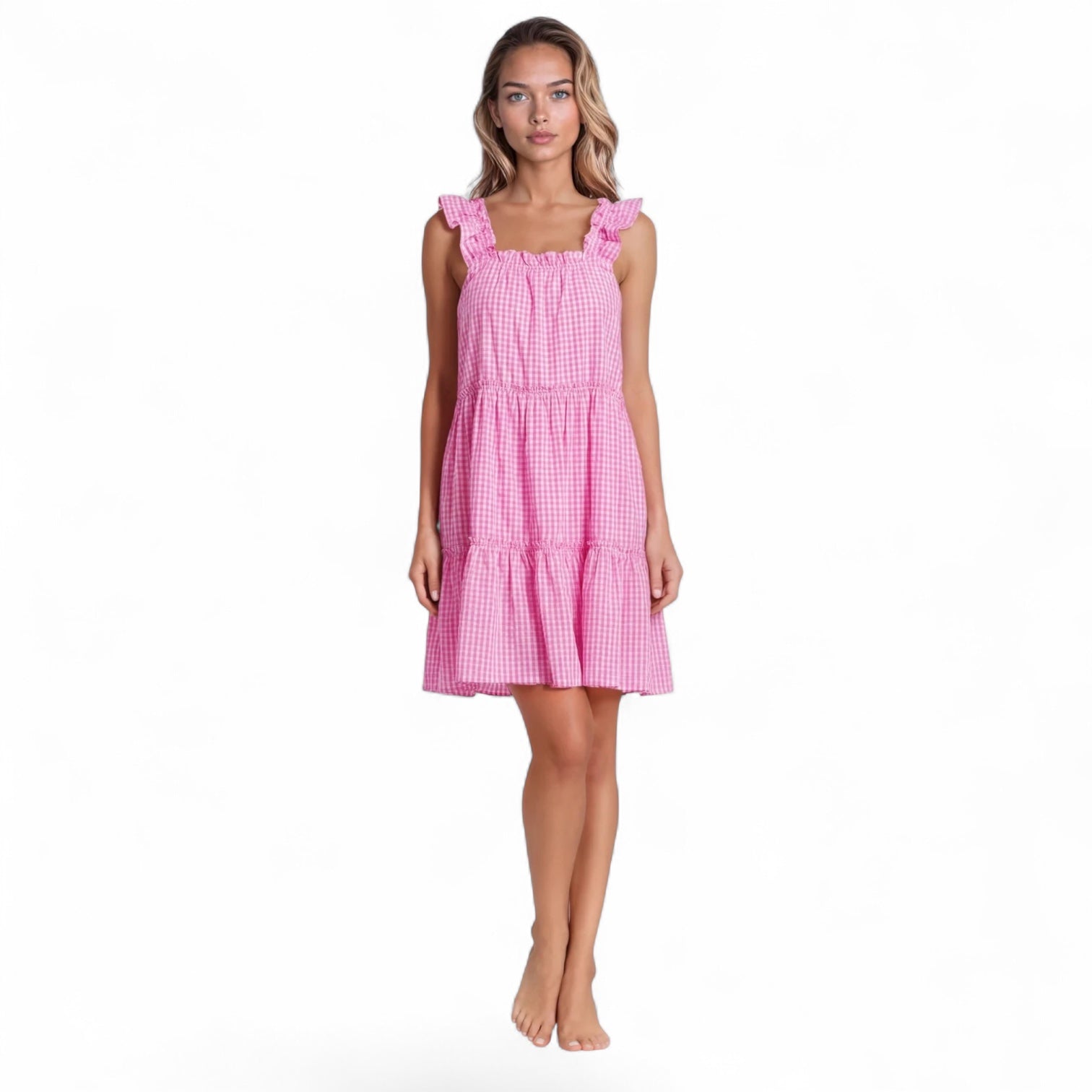 The prettiest pure cotton gingham dress – perfect as a nightie, a nap dress or a summer dress for the beach. The Gingham collection is made from luxurious organic cotton poplin and features the most beautiful ruffles on the shoulders and neckline with elastic under to allow for the most comfortable fit imaginable. The dress also comes with two additional elastic-bound mini frills around the body for extra stretch and comfort. This is a generous fit.