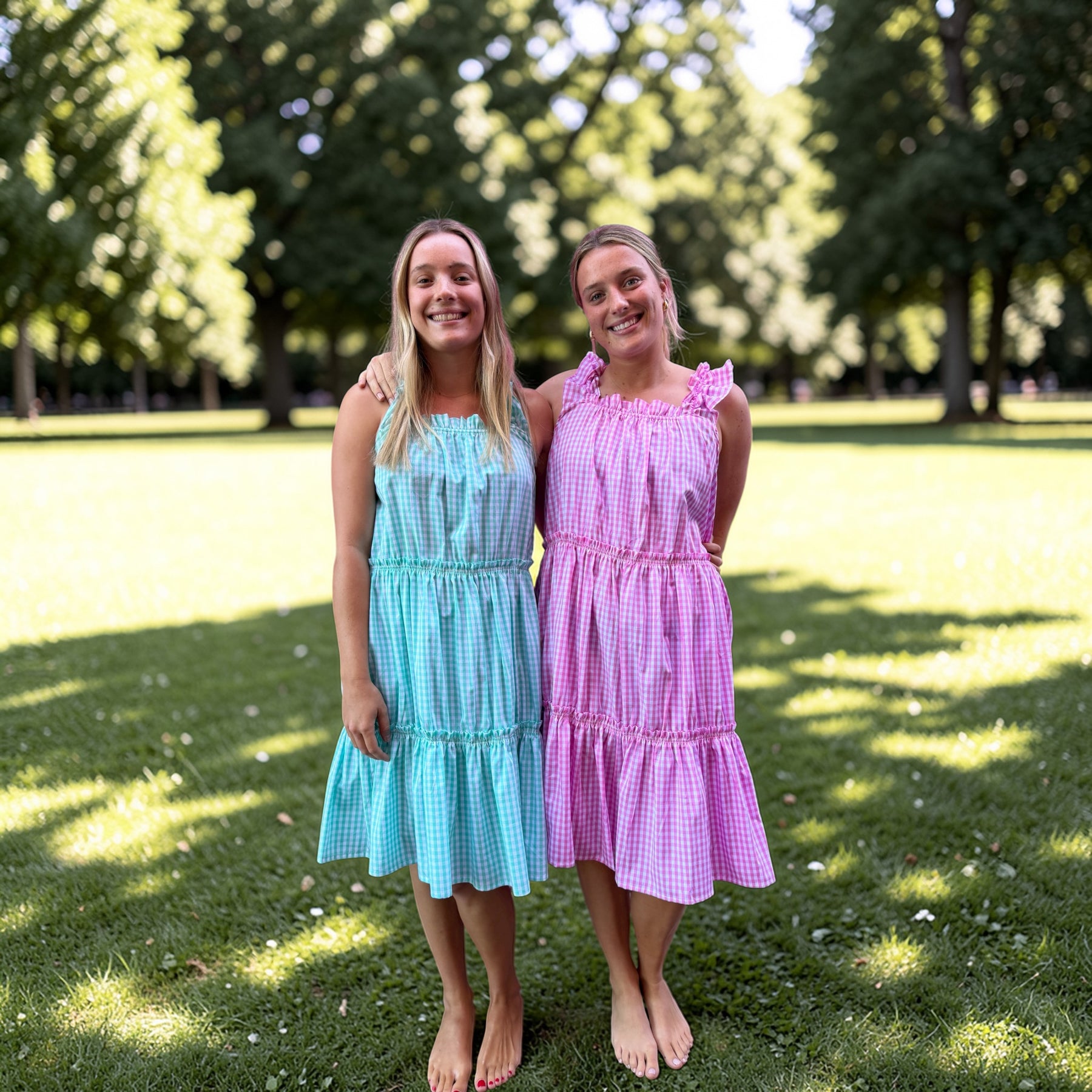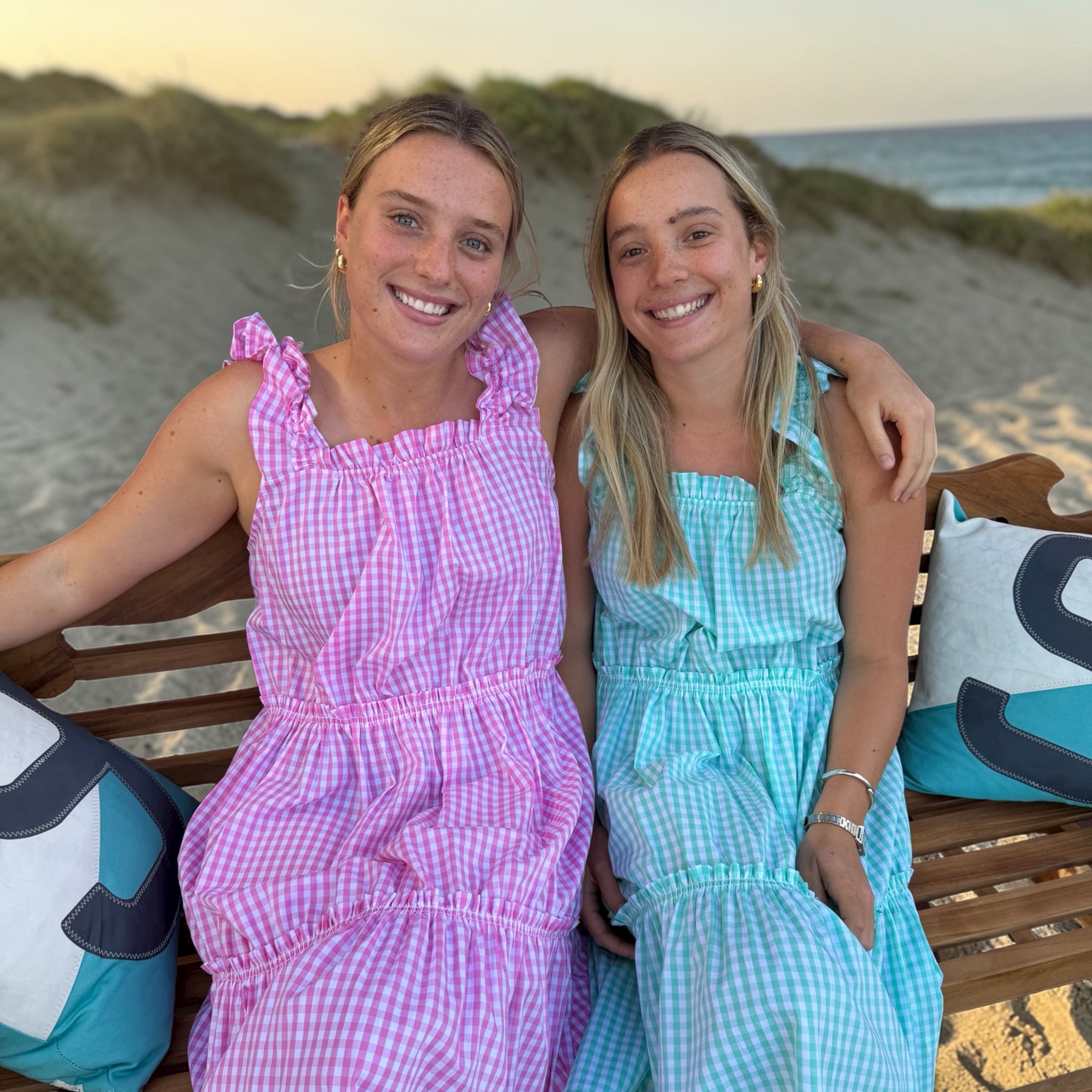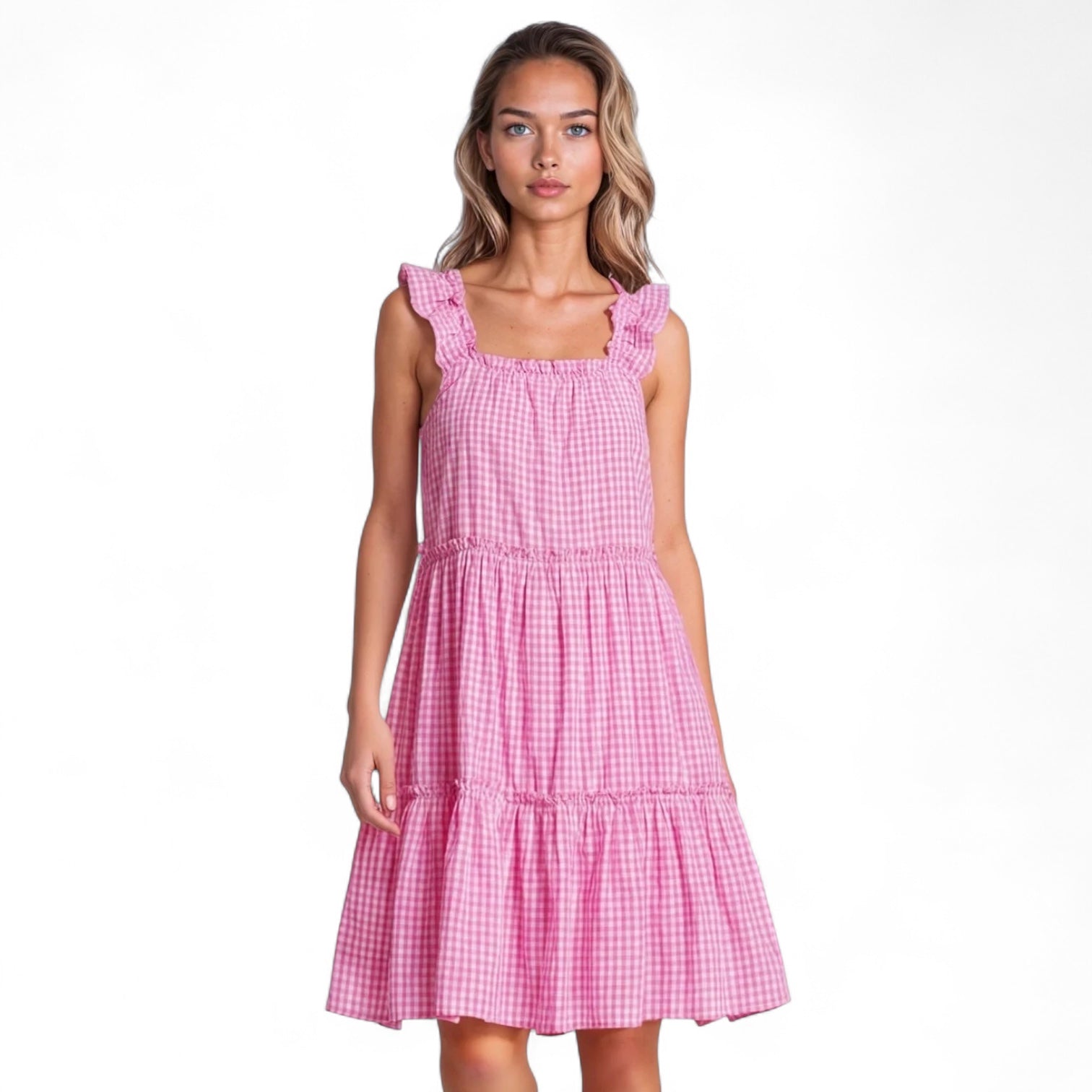 The prettiest pure cotton gingham dress – perfect as a nightie, a nap dress or a summer dress for the beach. The Gingham collection is made from luxurious organic cotton poplin and features the most beautiful ruffles on the shoulders and neckline with elastic under to allow for the most comfortable fit imaginable. The dress also comes with two additional elastic-bound mini frills around the body for extra stretch and comfort. This is a generous fit.
